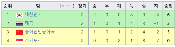 한국과 태국은 현재 월드컵 예선 C조에 속해 있습니다. C조에는 한국, 태국, 중국, 싱가포르 이렇게 네 나라가 속해 있는데요. 현재까지 순위는 아래와 같이 한국이 승점 6점으로 1위, 태국이 승점 3점으로 2위, 중국이 승점 3점으로 3위, 싱가포르가 승점 0점으로 최하위에 있습니다.